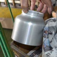 ヘラ絞り加工とは、アルミニウム、鉄、ステンレス等の鋼板を円形に切り、回転させて最終形状の金型に添わせるように変形させ、筒 状、容器状のものを作る技術です。